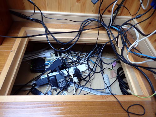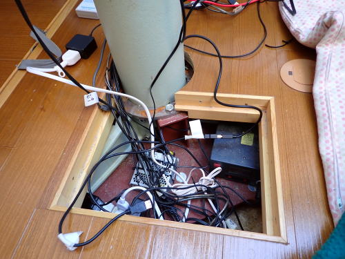 平成31年7月8日 もう少しで七夕。望遠鏡の配線をきれいにしようとしていたら赤道儀やオートガイダーにデジカメが反応しなくなった。 整理しようとコードを引っ張ったりしたせいか接続不良となったようだ。 いろいろやった見たが床下のコードが絡み合ってこれがどれだか・・・・ 女房からも手伝ってもらって二日掛かりで何とか復旧した。 もう一つメンテナンス用の点検口を作ってもらうことにした。
