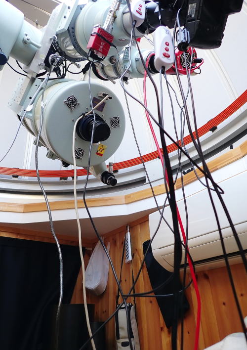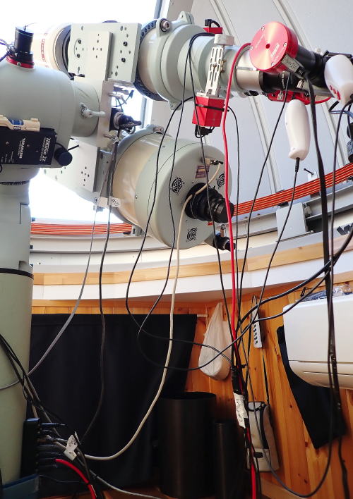 2021年7月2日 久しぶりに屋根に上がってドームを撮った。 屋根に上がるには垂直の梯子を昇らなくてはならない。 これが結構怖いのだ。 ![]() そろそろ土星と木星が昇ってくる。 観望用に接岸部にアイピースを付けた。 ![]() 2021年6月9日 オートガイダー成功。苦節4年 全システム稼働。やったー!! 苦節4年。ようやくオートガイダーの「PHD2}も極軸合わせの「ポールマスター」も稼働して全てのシステムが稼働した。 友人に頼めばすぐに解決するのだが、教えてもらってばかりでは勉強にならない。 何とか自力でと頑張った。途中でSOSを発信しようかと思ったが、苦労した甲斐があったか動いた。 お陰でいっぱい勉強させてもらった。 諦めなければ夢はきっと叶う。 PHD2オートガイダー ![]() 追尾精度は格段に改善した。追尾精度はこれまでの「1.50」位から「1.09」に改善。 極軸を合わせるポールマスター ![]() 2021年5月16日 極軸合わせ。ポールマスター不調。配線を再点検。 これまで極軸合わせは「ポールマスター」を使っていたが結構時間がかかる。 最近はポールマスターをやめて赤道儀で極軸を合わせていたが、老眼が進んだのか目盛がぼやけてよく見えない。 極軸がずれているのか最近は撮影した画像の1/3がガイドエラーで使えない。 再度「ポールマスター」を接続したが今度は接続不良で画像が写らない。 配線を再点検して何とか使用できた。 もしかしたら「オートガイダー」も接続不良が原因か? ![]() 配線はごっちゃごちゃ